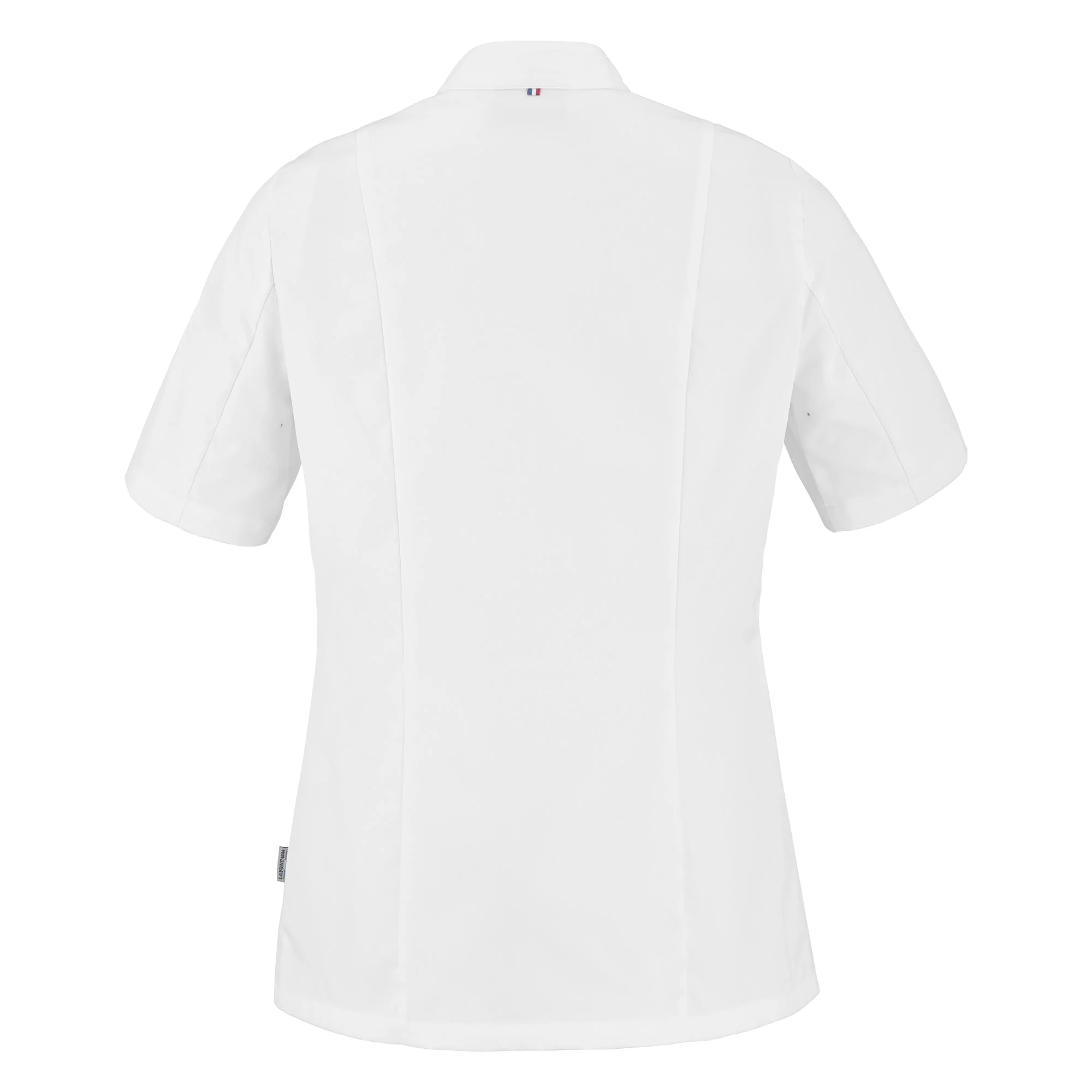 Une tenue de cuisine femme Prestige en 100 % coton. Cette veste de cuisine professionnelle se ferme par un plastron croisé réversible droite/gauche, muni de boutons faits et cousus à la main. Pour davantage de confort pendant le service, des découpes « bretelles » créent un cintrage discret et les poignets sont fendus. La veste de cuisine homme PLATINE se veut respirante grâce aux œillets brodés sous les bras ainsi qu’au volume d’aisance formé par les découpes de coude. Cette veste de cuisine manches courtes dispose également d’un galon bleu/blanc/rouge à l’encolure du dos, d’un thermo sur le panneau avant et d’une poche double compartimentée pour les stylos. Disponible en version homme.