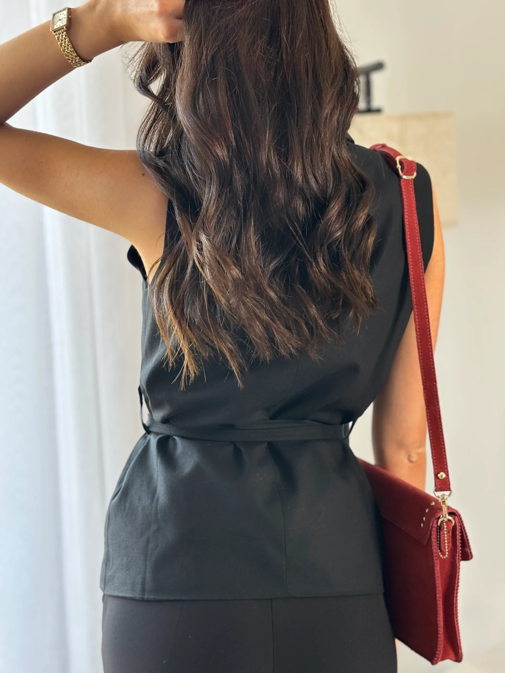 La veste sans manches Luciana est le choix parfait pour une tenue sophistiquée. Avec son effet blazer, cette veste noire sans manches apporte une touche élégante à n’importe quelle tenue. Les boutons sur le devant et la ceinture amovible offrent une coupe cintrée flatteuse pour mettre en valeur votre silhouette. Un must-have pour votre garde-robe.