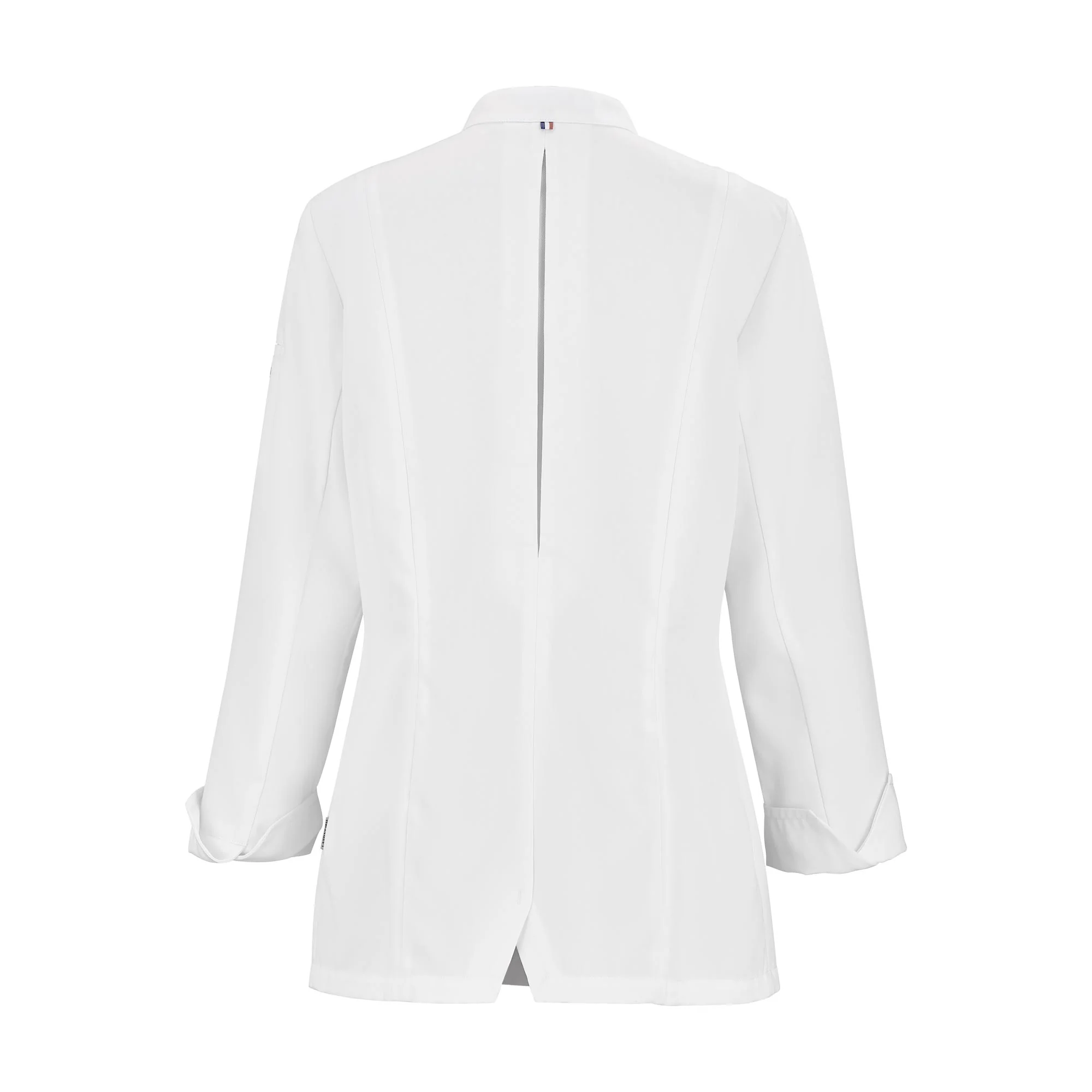 Une tenue de cuisine professionnelle au style « Cheffe » revisité. Composée à 50% lyocell 50% polyester recylé avec traitement défroissabilité, la veste de cuisine femme TITANE est facile d’entretien. Son plastron croisé avec finition 3 plis religieux est maintenu par pressions extra-plates. Pour un confort optimal, des empiècements respirants en maille antibactérienne « mesh » sont présents sous les bras et sur le soufflet d’aisance du dos. Cette veste de cuisine femme manche longue possède des coutures intérieures ouvertes gansées, un galon bleu/blanc/rouge à l’encolure du dos et une poche à stylo soulignée d’une broderie LAFONT. Les découpes « bretelles » créent un cintrage, la ligne de coude formant un volume et les poignets fendus facilitent les mouvements. Disponible en version homme.