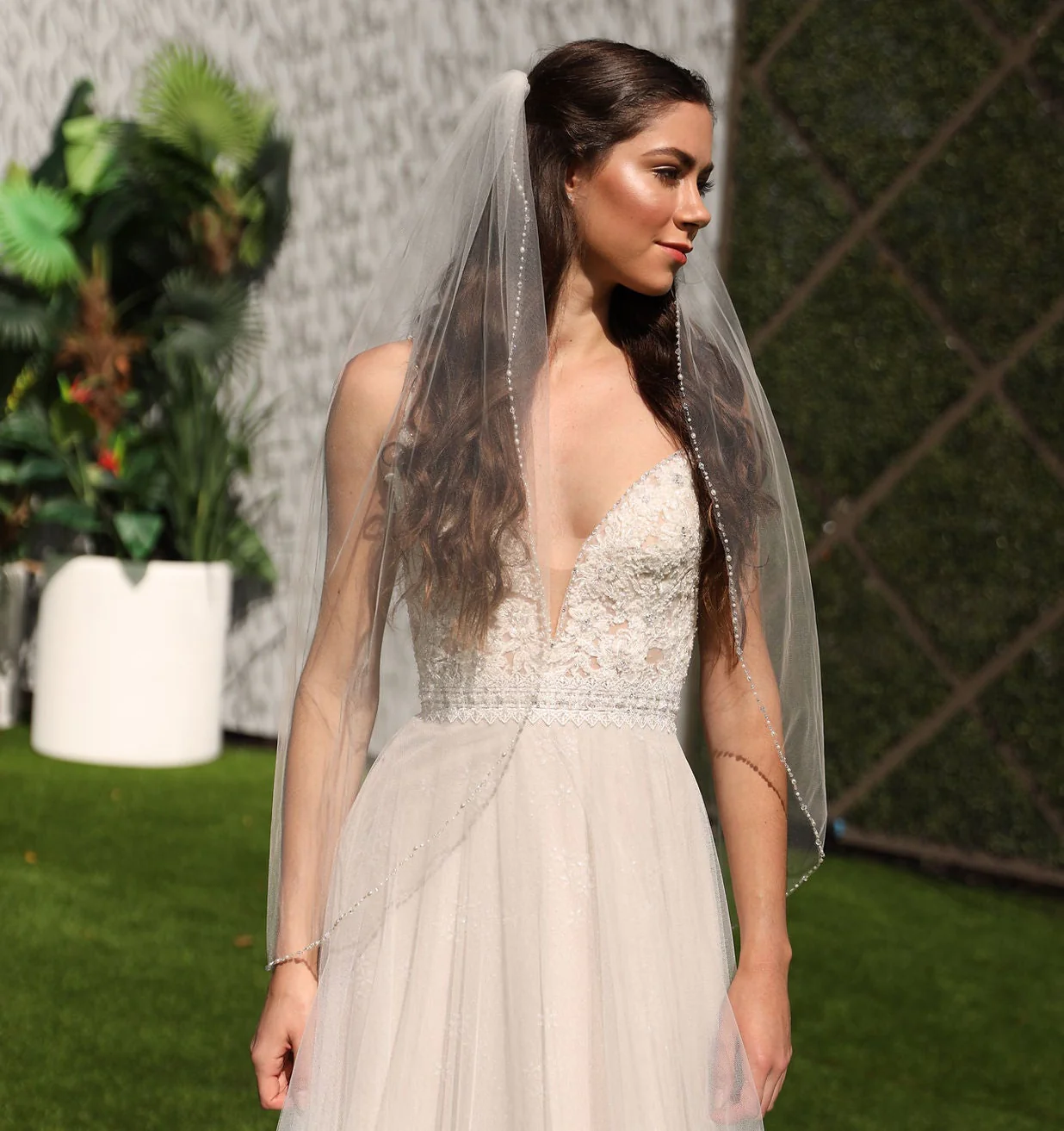 Ce voile de mariée court, délicatement doublé et orné de pierres sur les bords, offre une élégance raffinée. Sa première couche mesure 29 pouces de longueur, tandis que la seconde s’étend sur 35 pouces, avec une largeur de 48 pouces, pour un effet léger et sophistiqué.